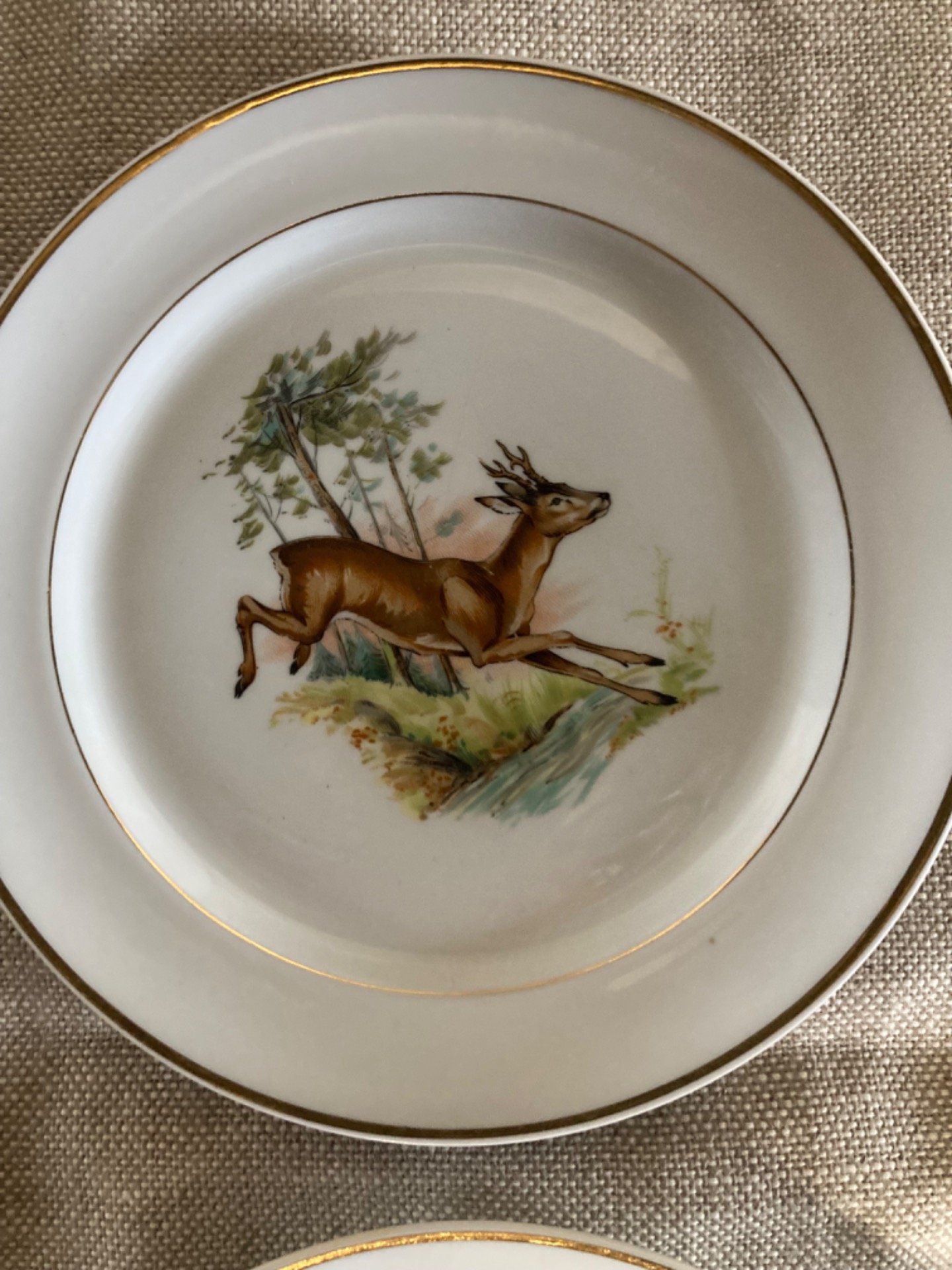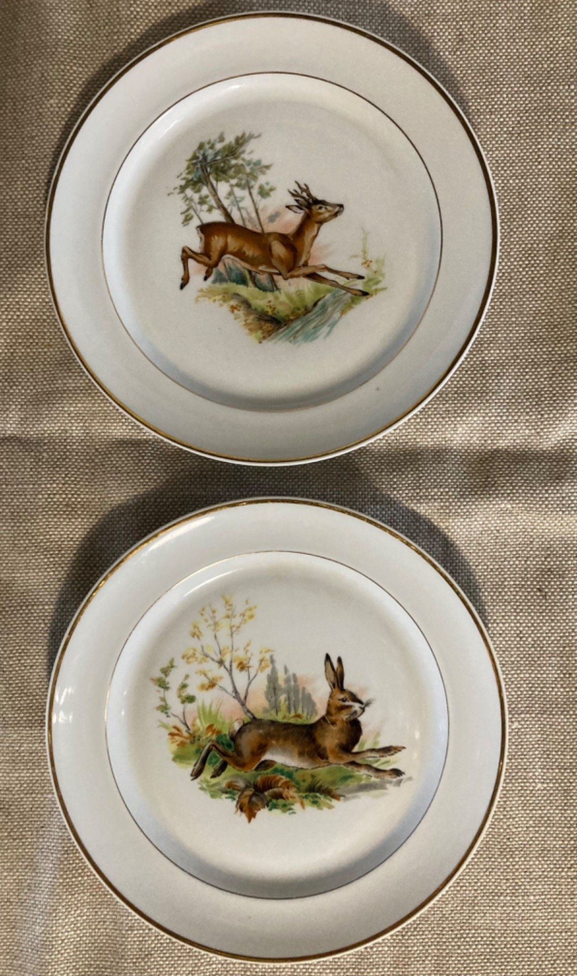 Assiettes a dessert, porcelaine de limoges, chevreuil et lapin 21 cm