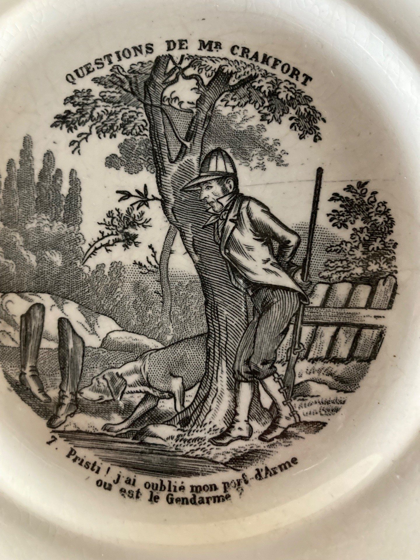 Assiette humoristique Questions de Mr Crakfort. Assiette à gibier en porcelaine tendre par HB à Choisy le Roi