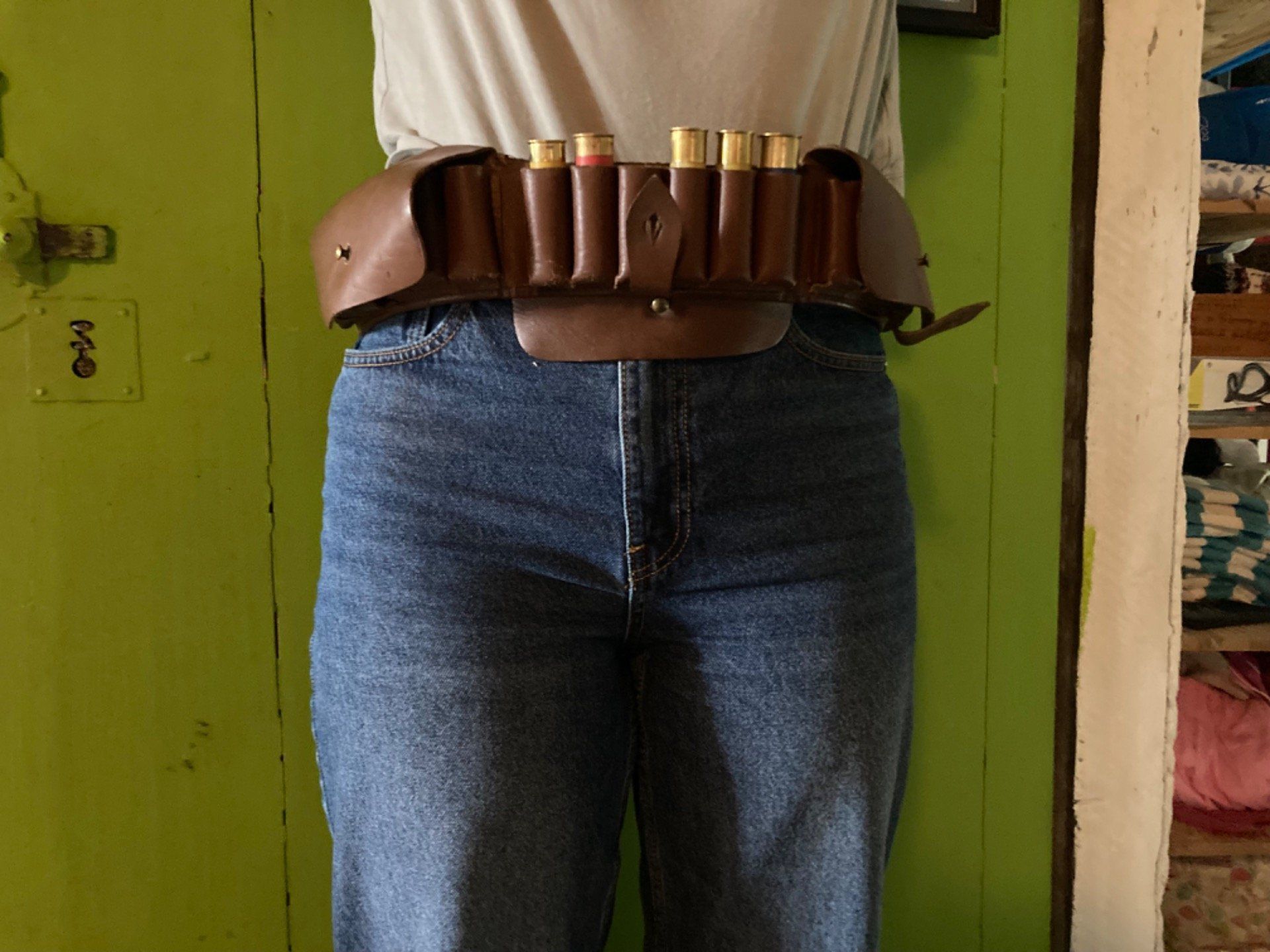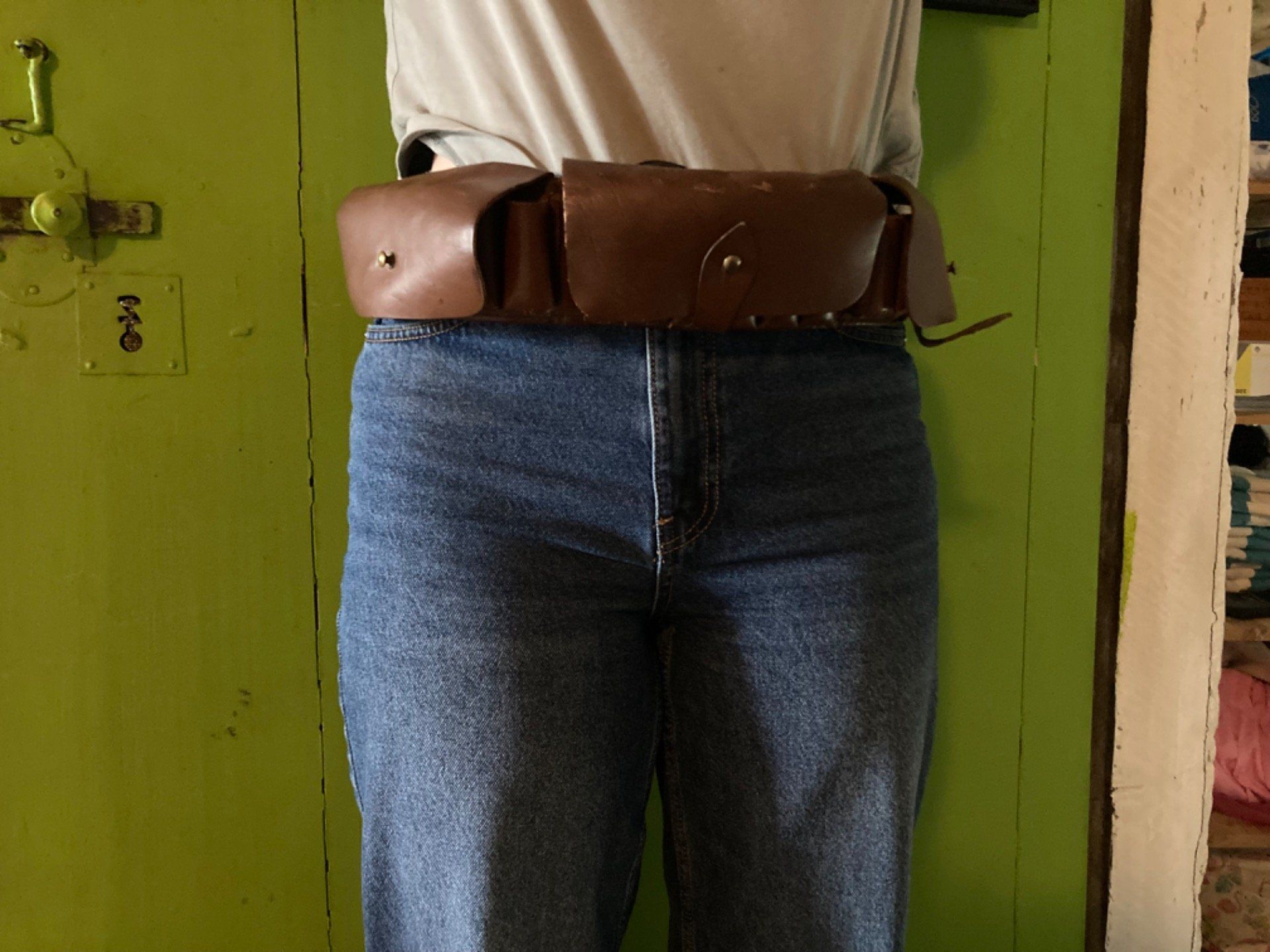 Cartouchière en cuir marron. Dim 126 x 8,5 cm