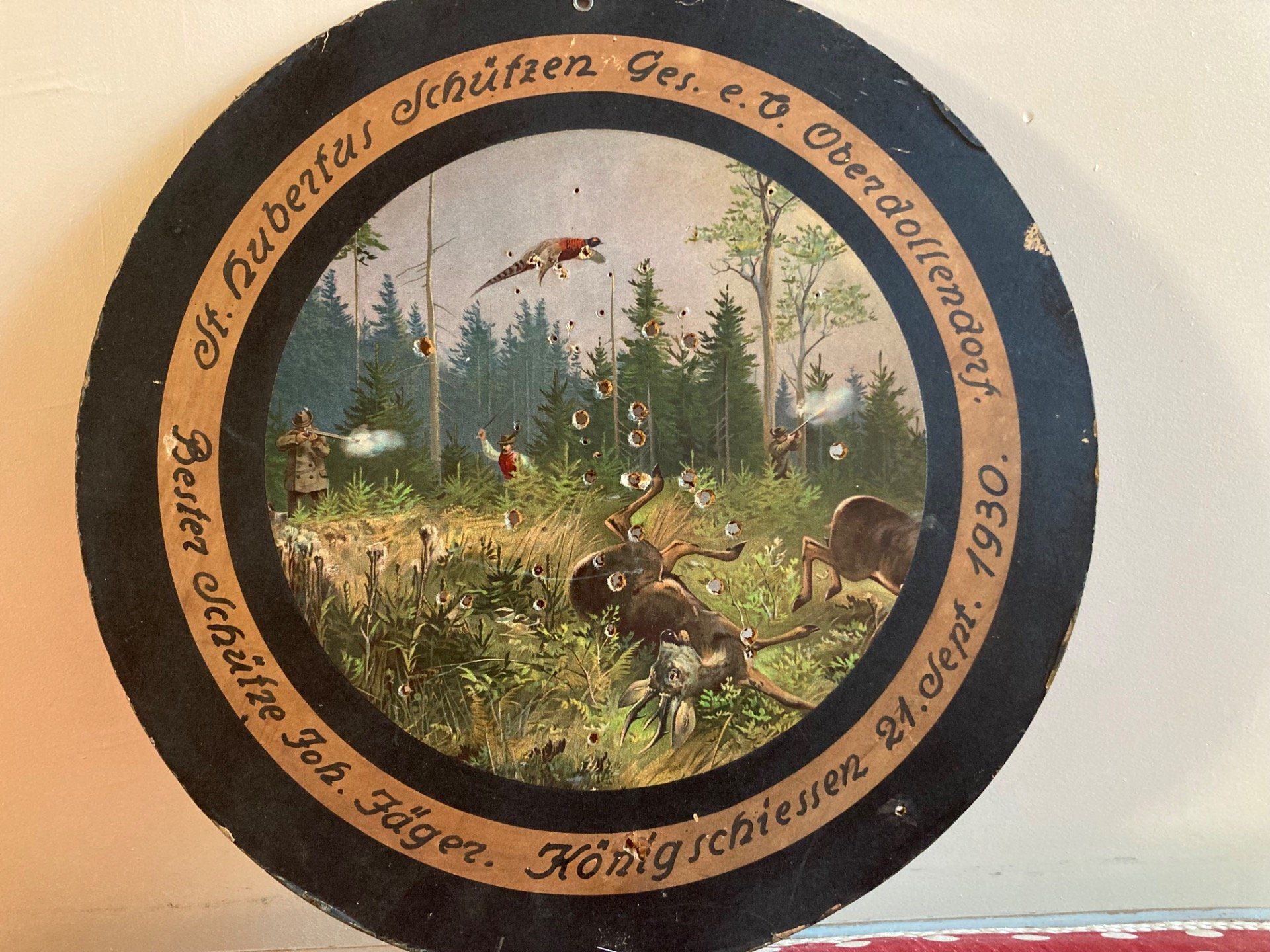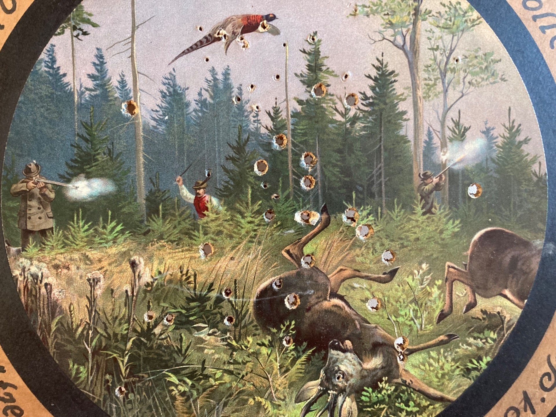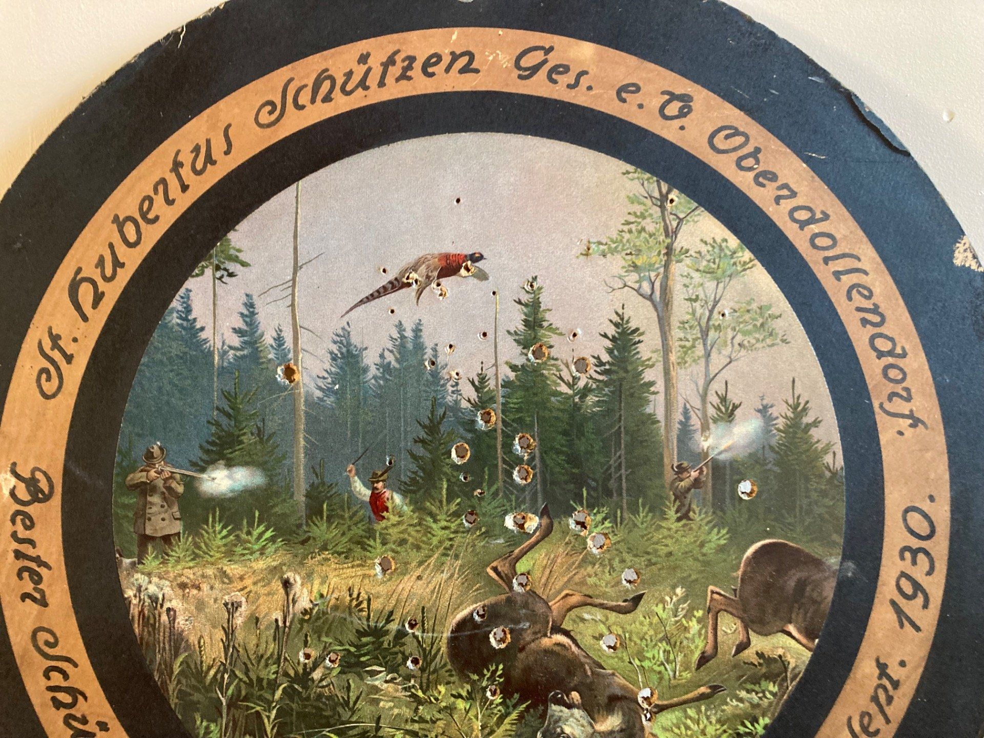 Cible d honneur ancienne. La cible en carton est décorée d’une impression colorée représentant un chasseur tuant un cerf et faisan. La cible d honneur est une récompense traditionnelle dans les compétitions de tir en Allemagne. Septembre 1930 Diam 48 c