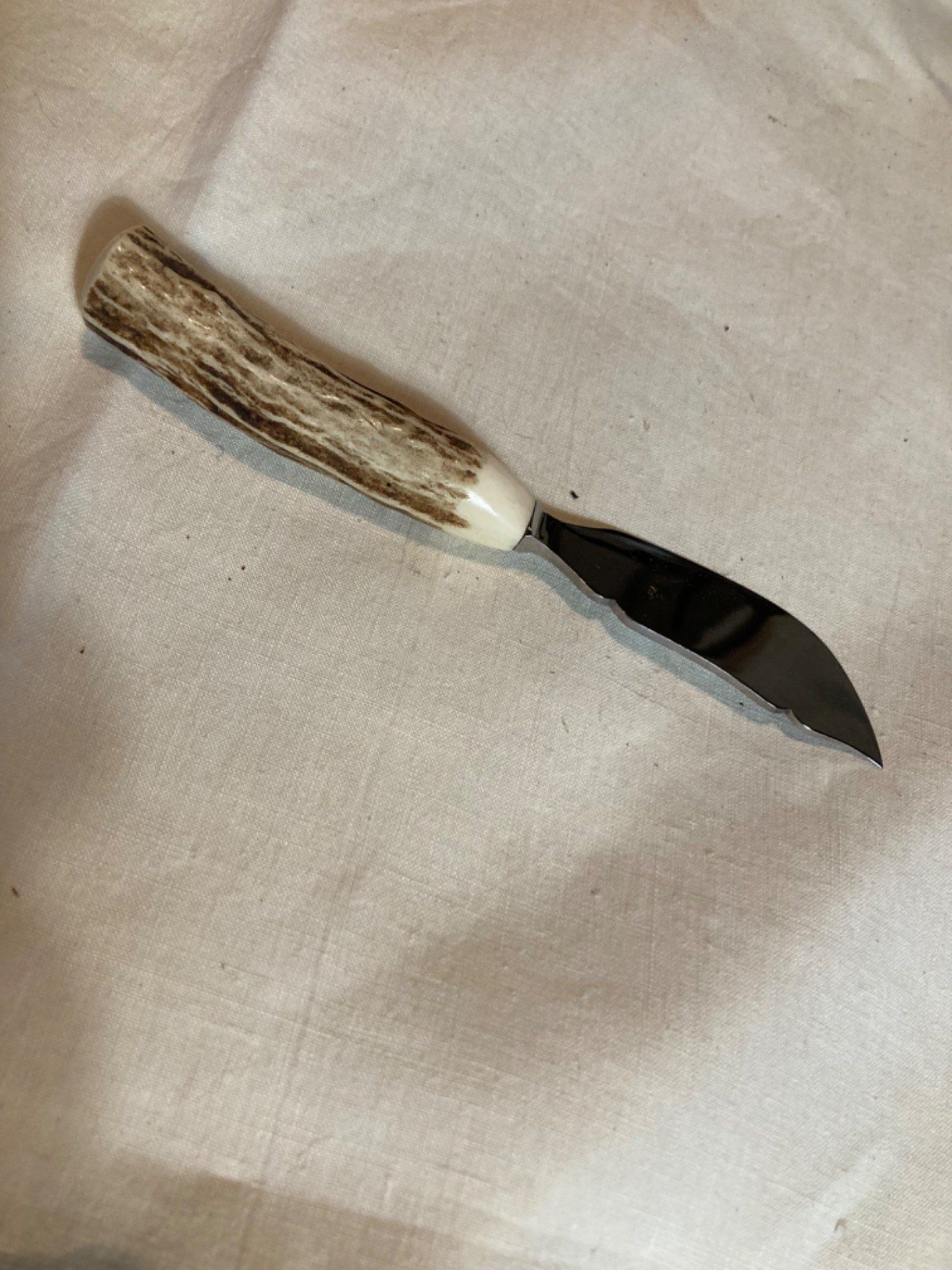 Couteau à fromage, lame en inox, manche en bois de chevreuil. Longueur 15 cm avec une lame de 7 cm.