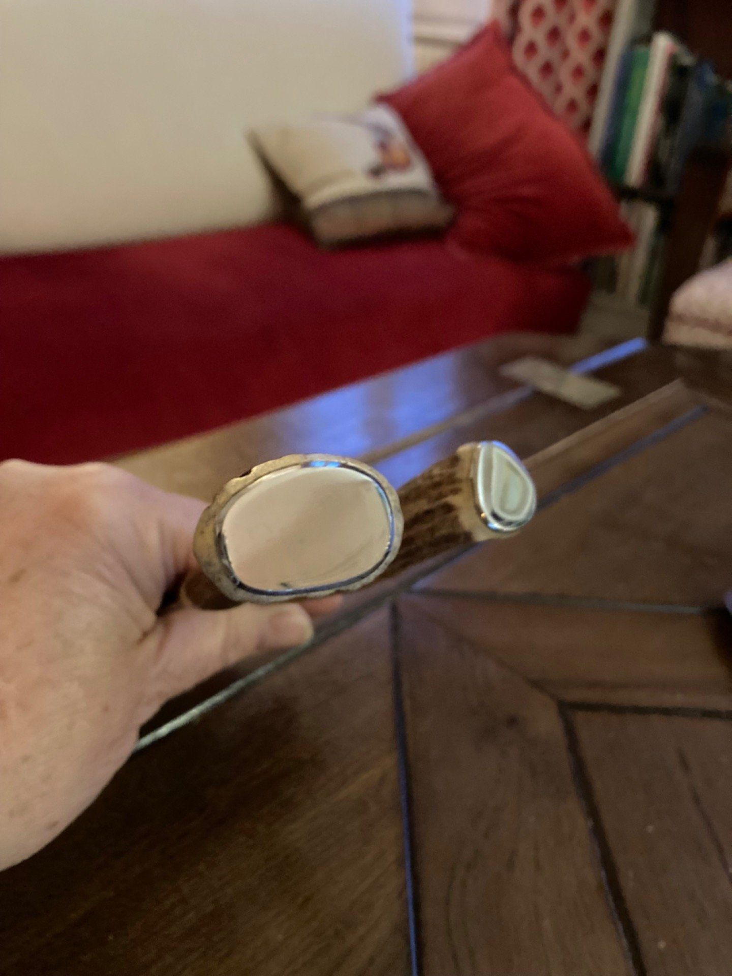 Couteaux à beurre manche en bois de chevreuil, lame en inox. Le GDMA fait 20 cm avec une lame de 10 cm. Le petit fait 15 cm avec une lame de 6 cm. En bout de la forme un empiècement en inox