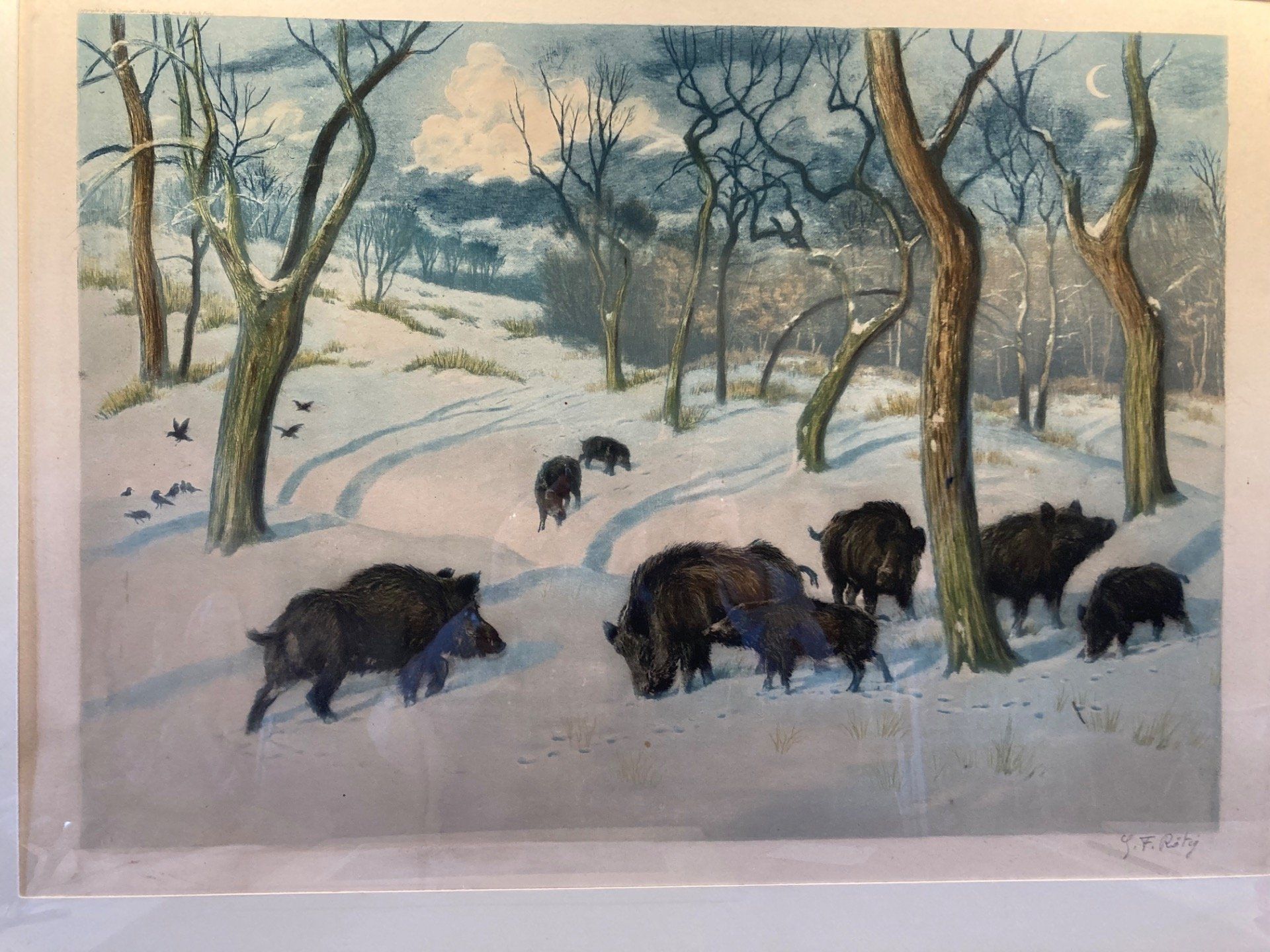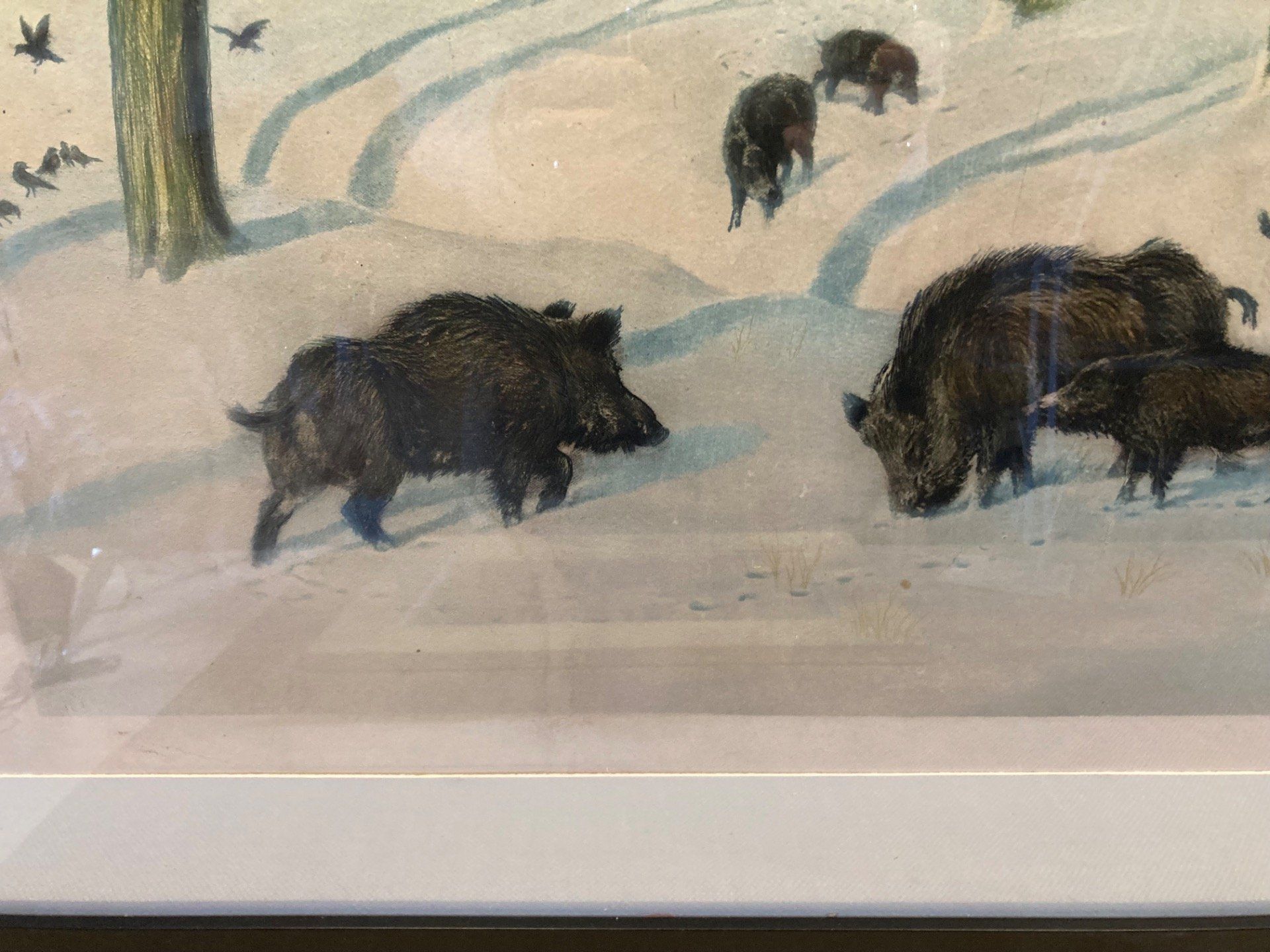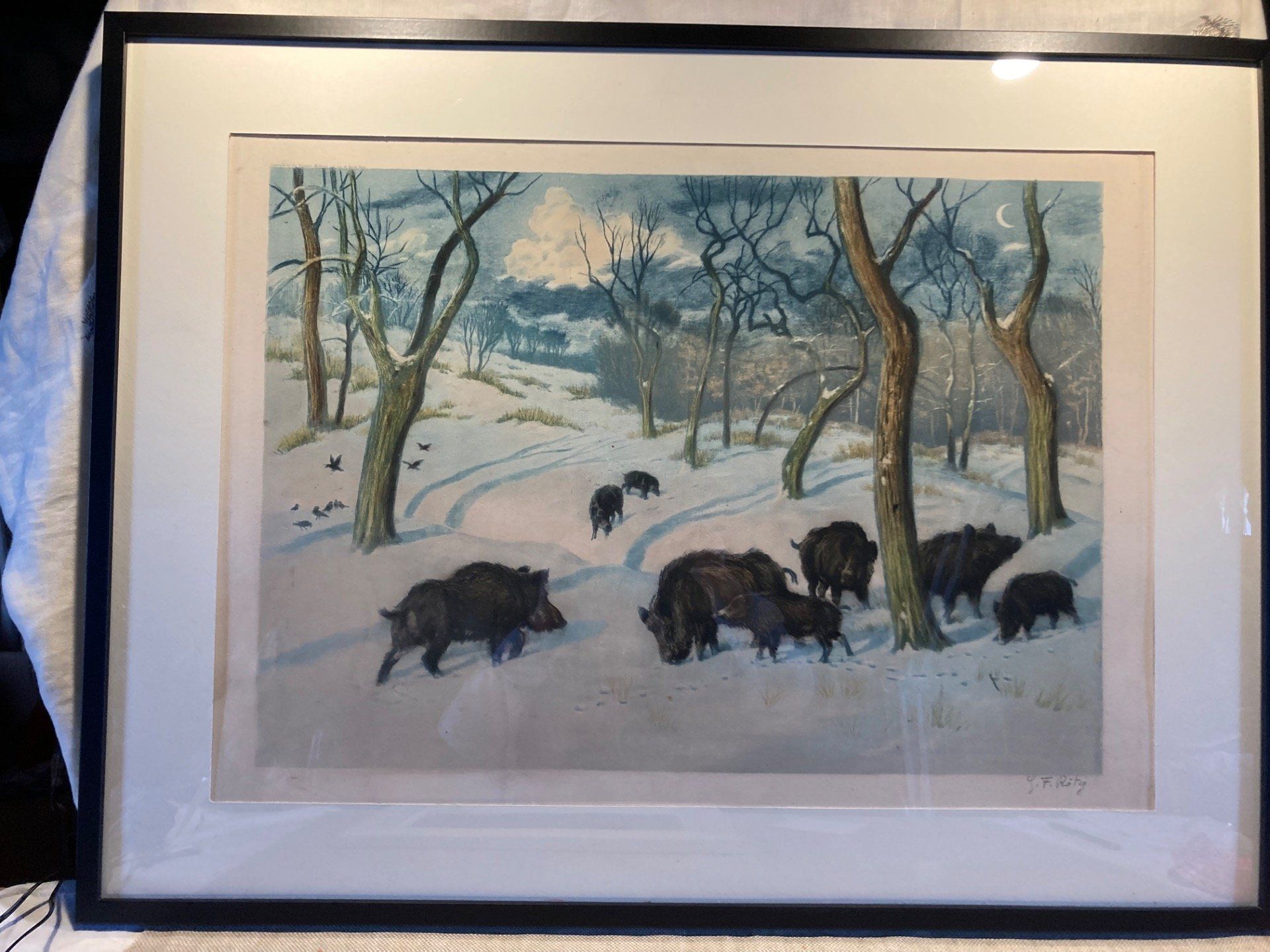 Rotig, les sangliers dans le sous bois enneigé. Gravure signée en bas à droite. Gravure 82 x 62