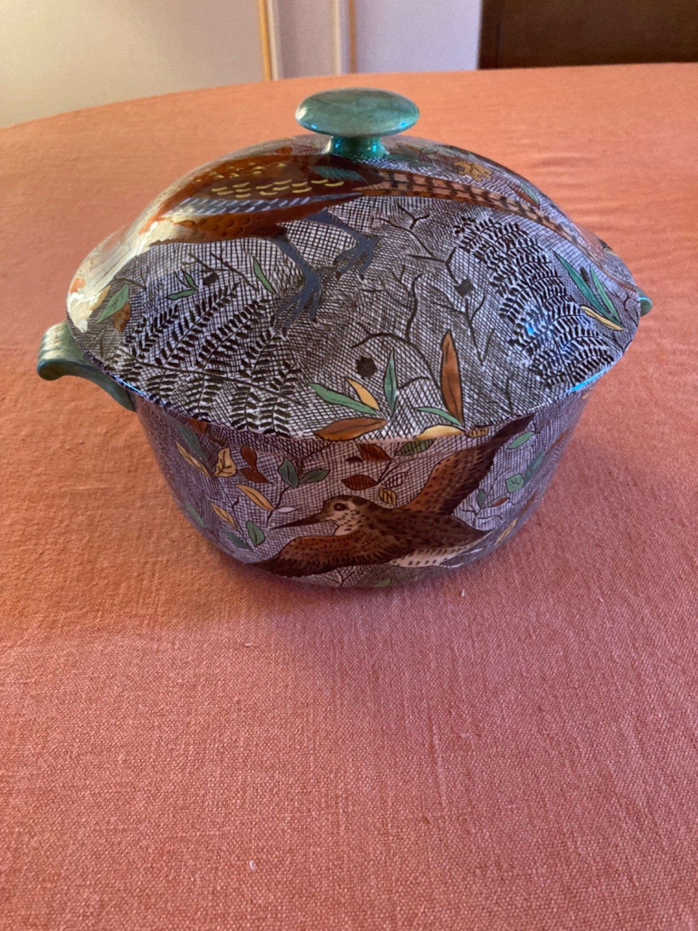Gien Rambouillet modèle dessiné par Jean Bertholle. , le légumier, ce décor peint à la main a été créé en 1955 pour équiper les chasse présidentielle, du Président Rene Coty. H 10 cm Diam 20 cm. Avec couvercle 15 cm.