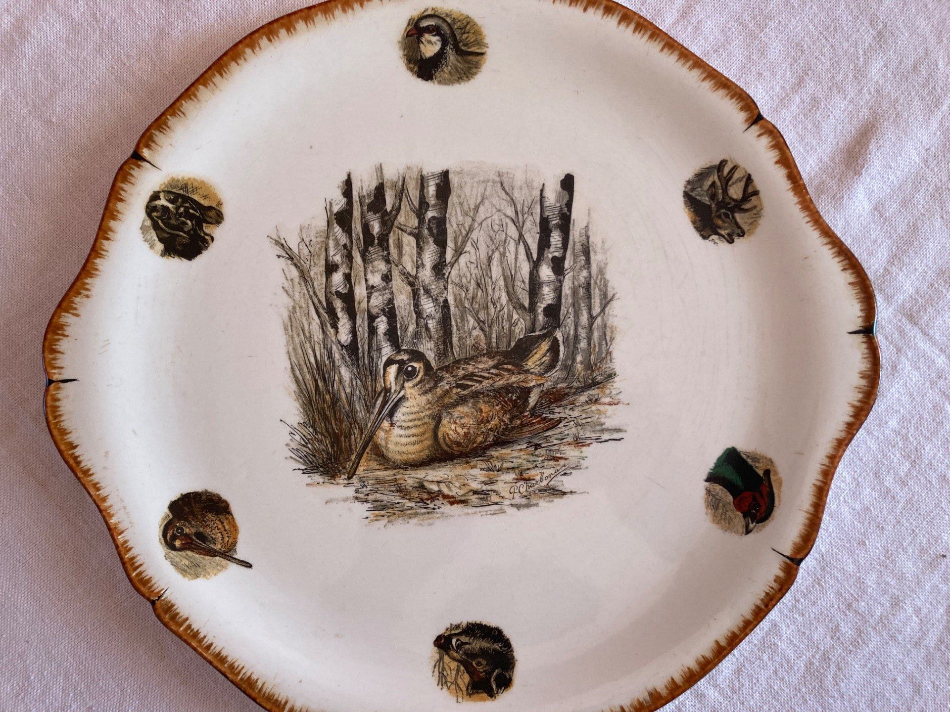 Plat rond à décor de gibiers, becasse au centre Limcolor