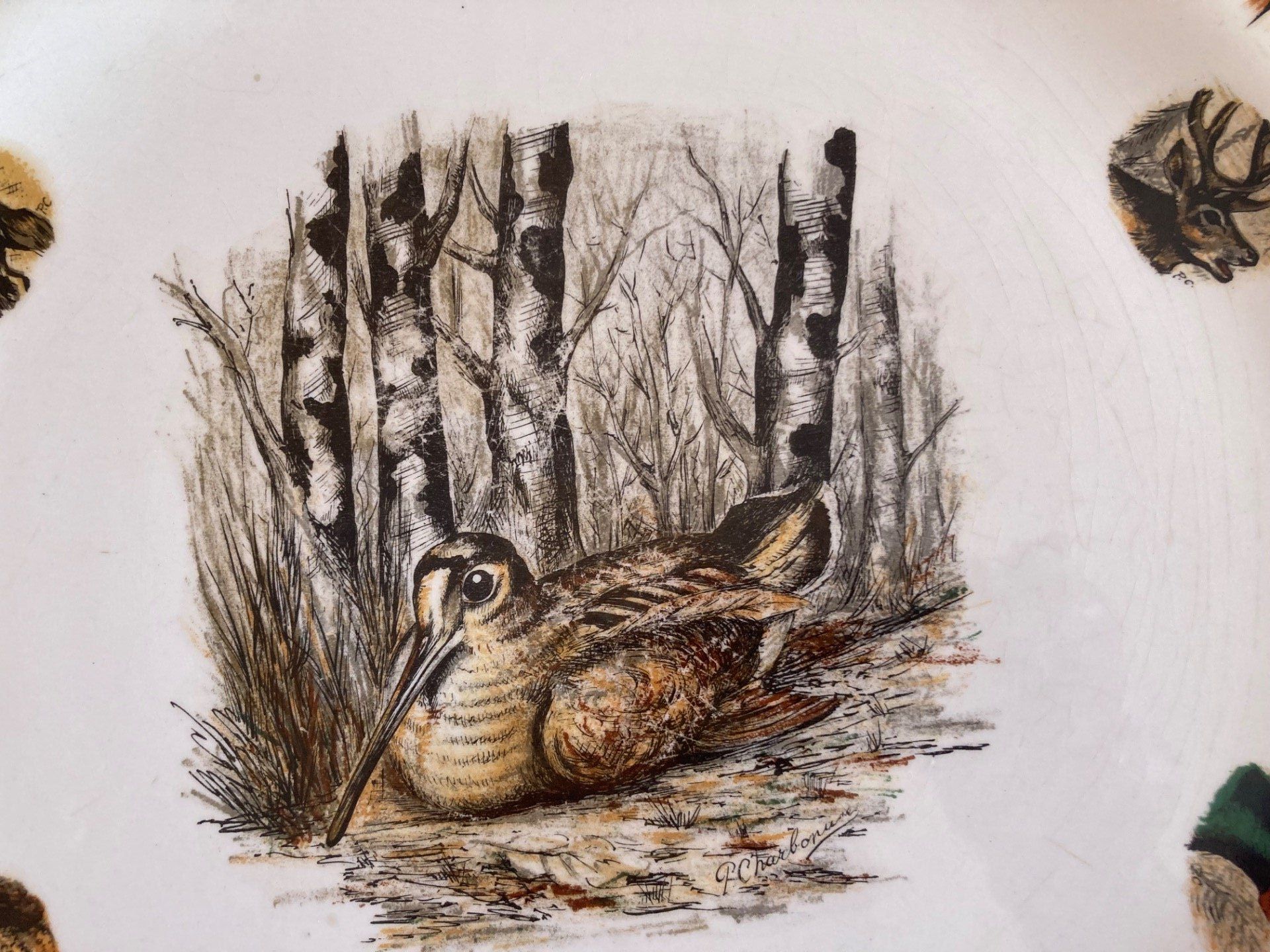 Plat rond à décor de gibiers, becasse au centre en porcelaine Limcolor signé P Charbonnier Diam 35 cm