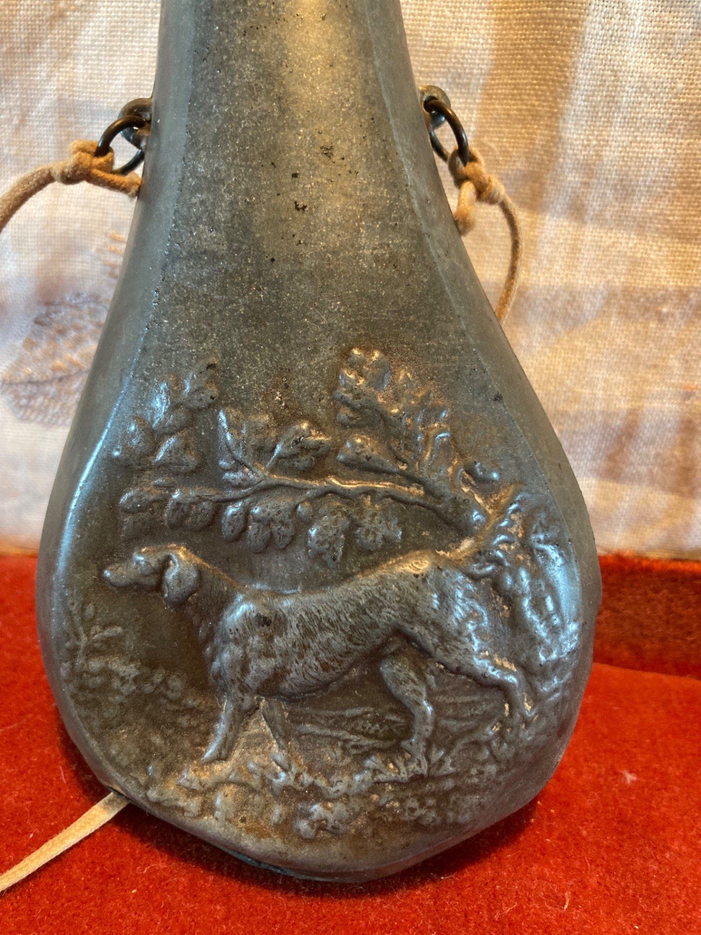 Poire à poudre à décor de chien en taule. Un peu cabossée. Dim 20 cm