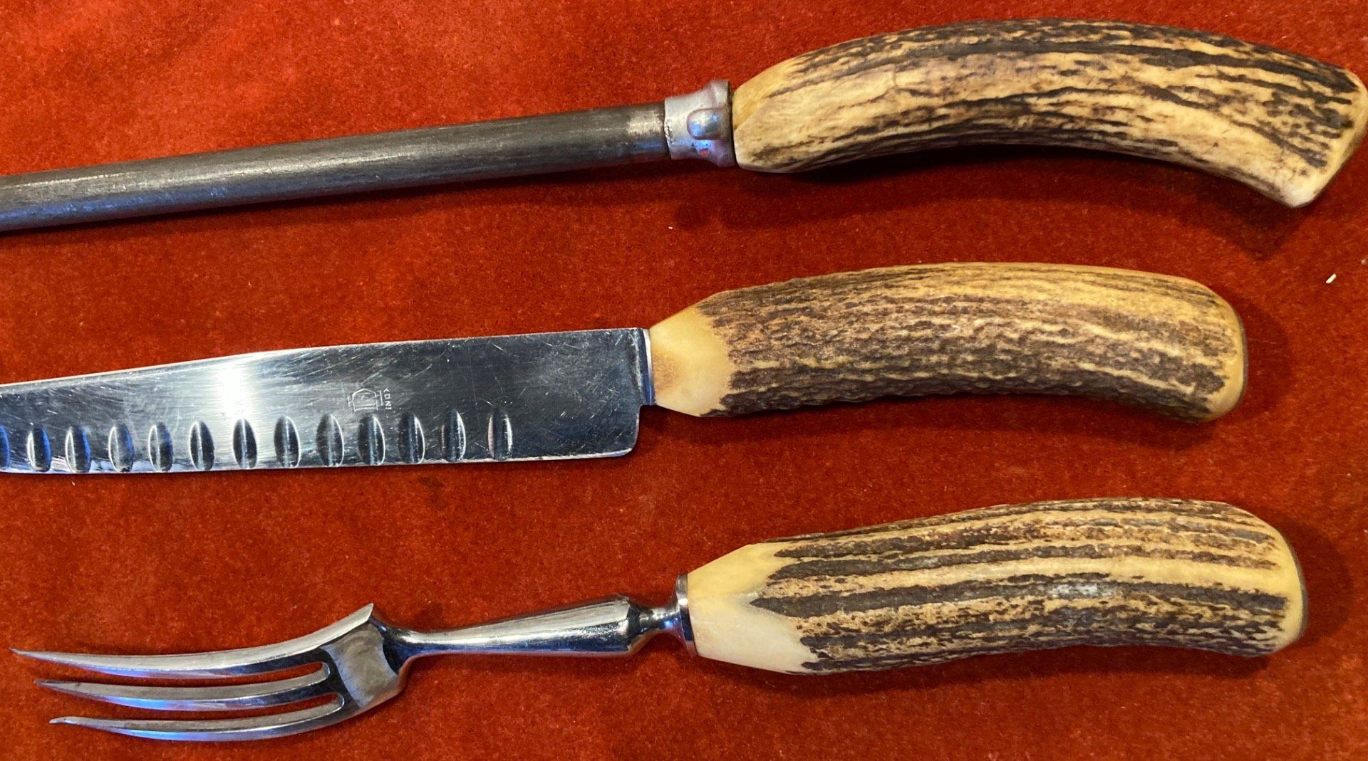Service à découper, manche en bois de cerf. Fusil 43 cm, couteau 32 cm, fourchette 28 cm