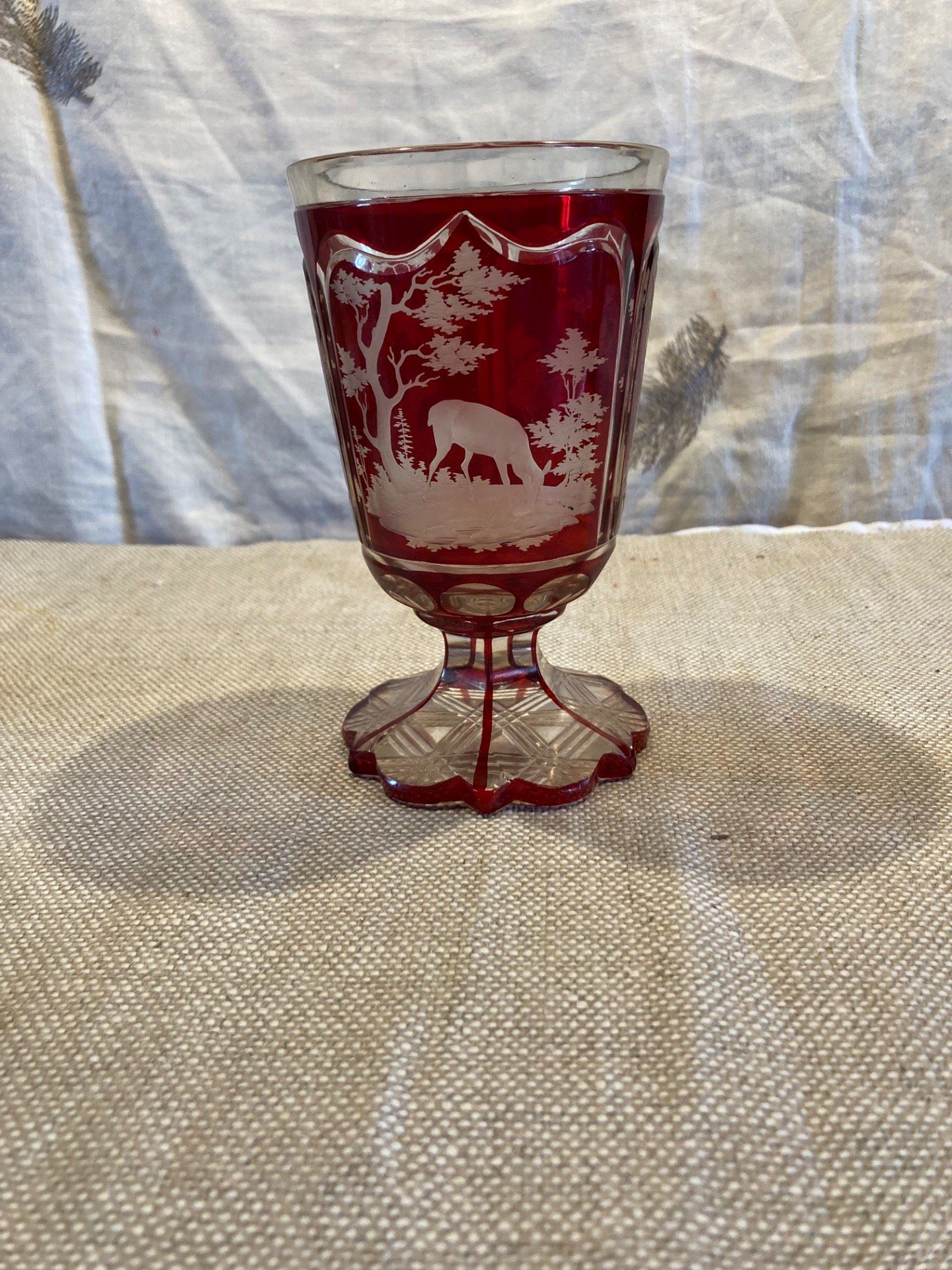 Vase en cristal de bohème taillé de scène de chasse de couleur rouge rubis.