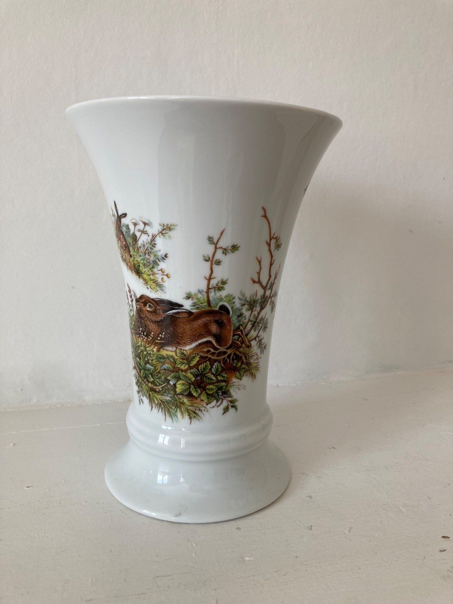 Vase en porcelaine à décor de Becasse et lievre. H 19 cm Base 10 cm. Haut du vase 13,5 cm.